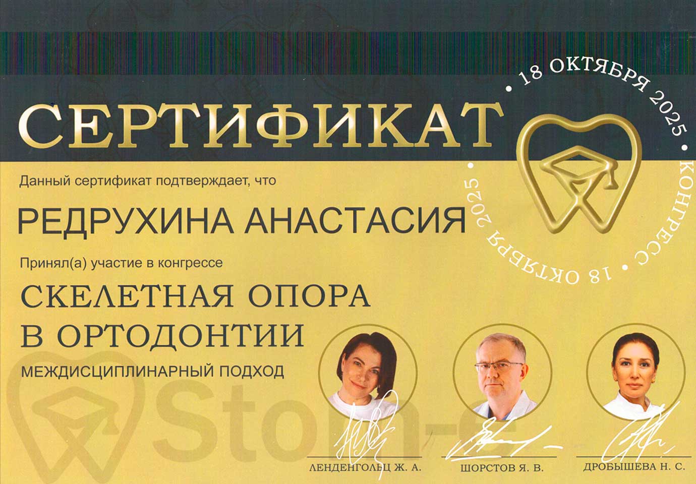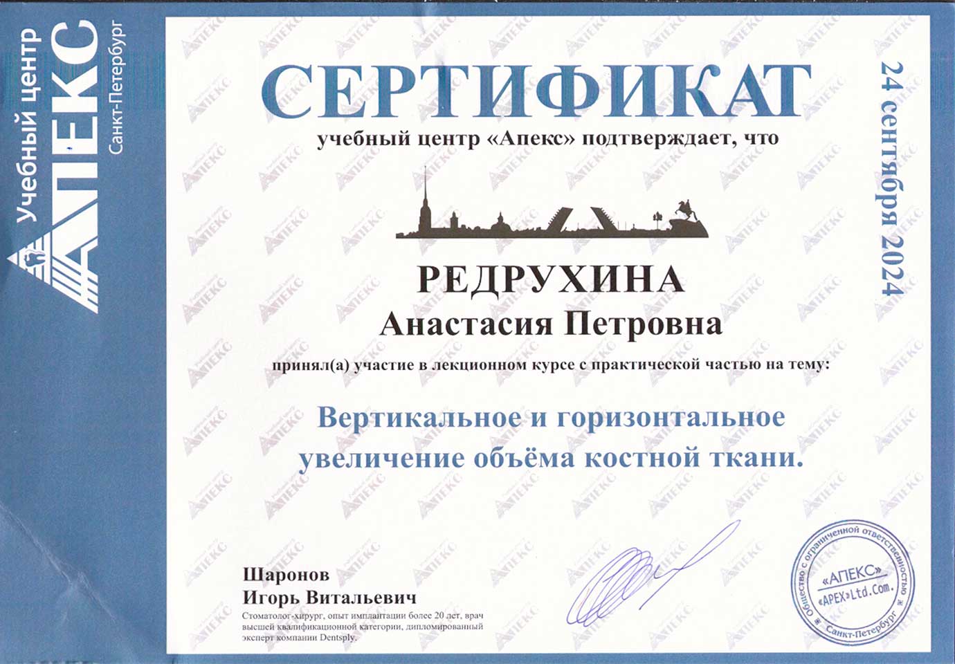Я обратилась в клинику для установки имплантов. Лечение проводила Редрухина Анастасия Петровна. При первом посещении было сложное удаление зуба и подготовка к установке имплантов. Удаление прошло успешно, без осложнений после операции. При втором посещении прошла операция по установке имплантов. Операция прошла безболезненно с чётким описанием действий хирурга во время операции. Хочу отметить высокий профессионализм, доброе и внимательное отношение к пациенту, подробное объяснение плана лечения, доброжелательную обстановку. Всё это настраивает на позитивное решение проблемы, доверие доктору и устраняет любой страх, и сомнения сопутствующие, таким сложным хирургическим процедурам. Спасибо огромное Анастасии Петровне, Вы замечательный доктор и прекрасный человек!